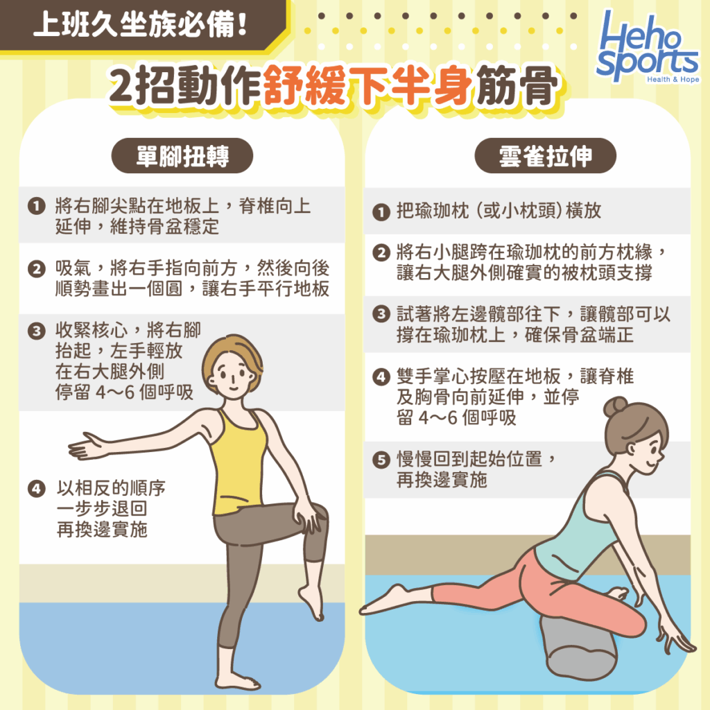 長時間久坐讓你屁股痛、下半身僵硬循環差嗎?久坐是現代人難以避免的事情,尤其工作性質是屬於坐在電腦前處理事務的上班族,往往都是一坐到下班,其中只有上廁所、午休時間會起來走動一下。想要改善久坐帶來的酸痛不適,推薦給你2招動作,透過簡單的伸展,解放緊繃的肌肉。